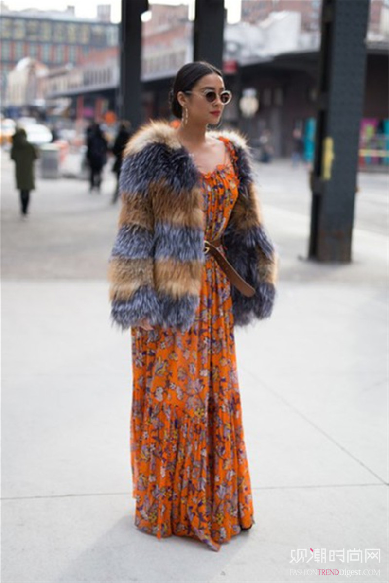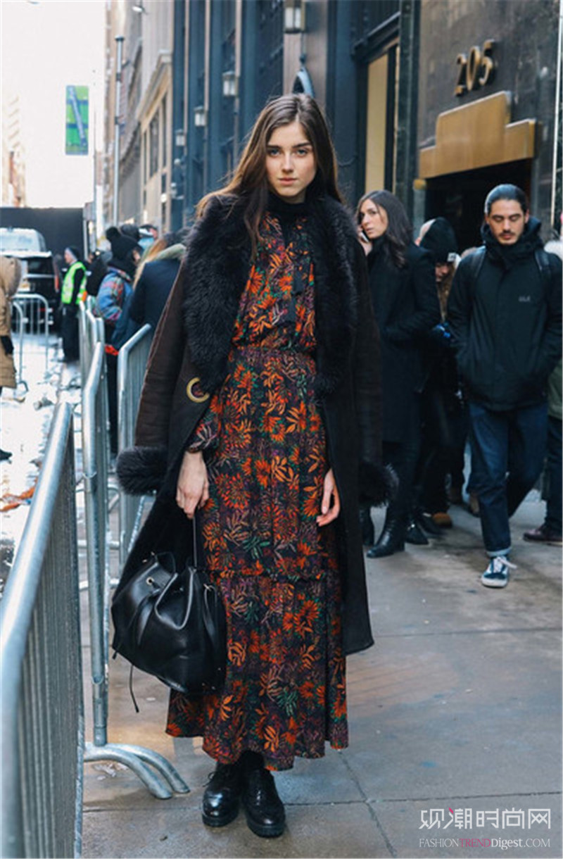 暖色系连衣裙给人的感觉更加随和亲切,搭配深色长款外套也是毫无违和感。
