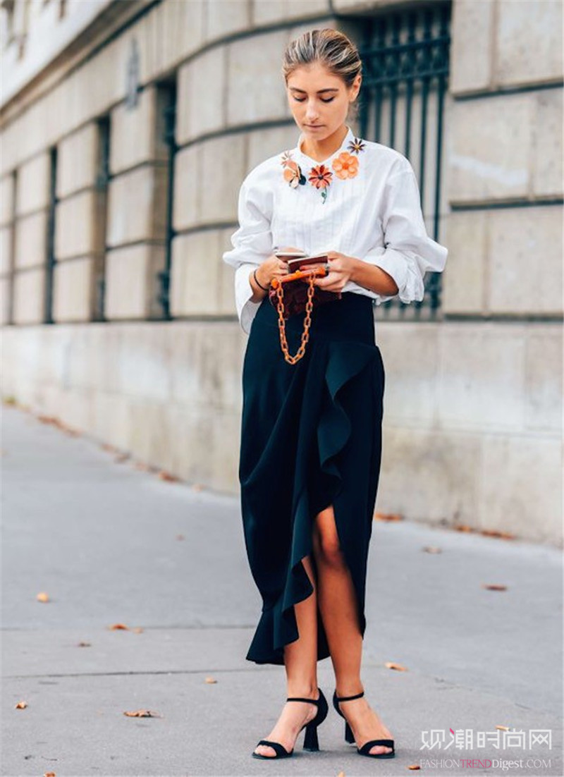 白色衬衫有着百搭的特性,搭配不规则花边连衣裙,穿出独特的酷帅气质。