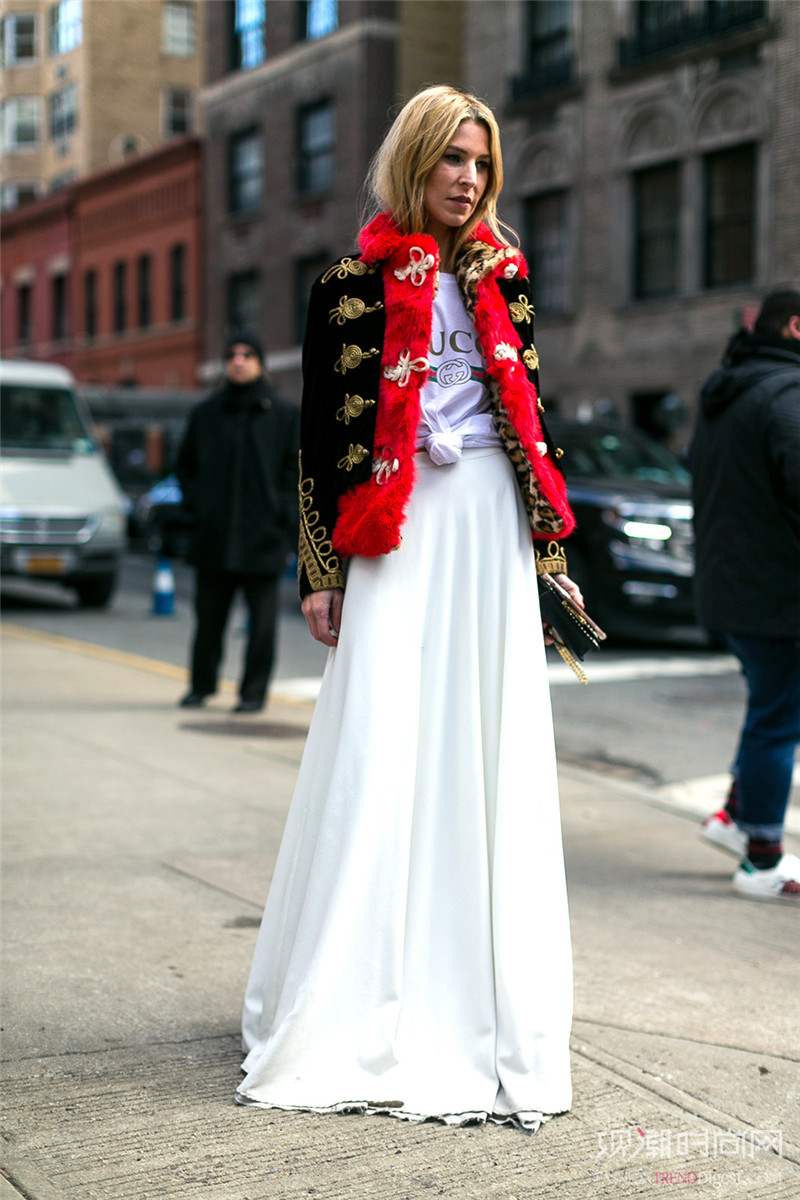 白色长裙一件就能穿出仙气十足的味道,搭配红色外套进行提亮,非常有腔调。