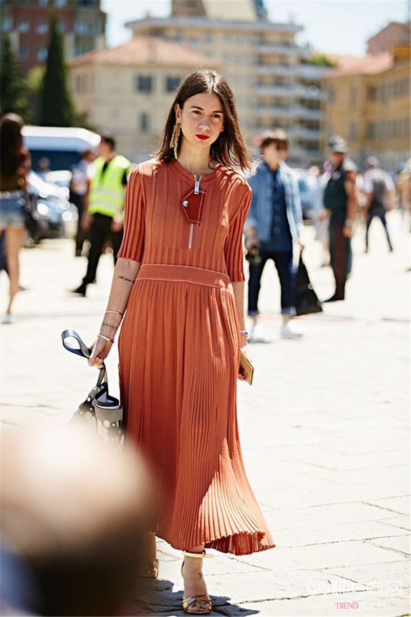 砖红色褶皱连衣裙,基本款型穿出自然优雅气派,竖形褶皱起到显瘦效果。