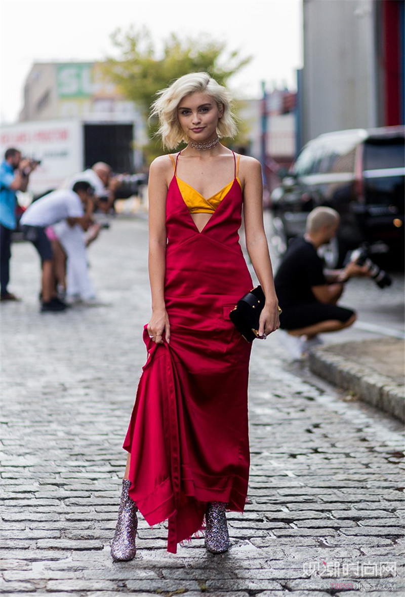 基本款纯色吊带裙尽显优雅魅力,搭配姜黄色吊带衫,色块的碰撞组合显得衣着更加大胆随性。