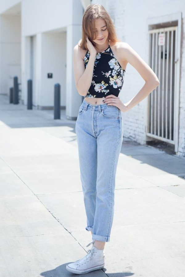想要把Mom Jeans穿出青春感,露胃其实就是一个不错的方法。搭配一字肩的Crop Top和小白鞋,加上一款Mini双肩包,你就是街拍Queen!
