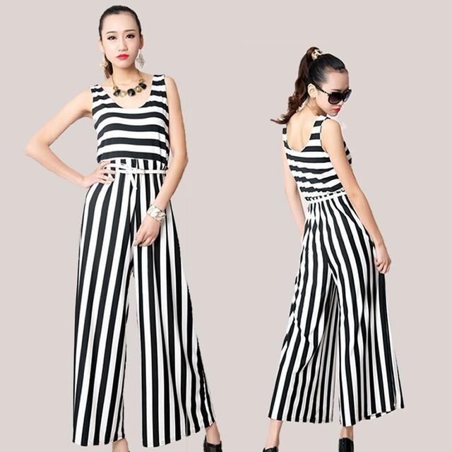 宽松露肩显瘦撞色条纹高腰阔腿裤