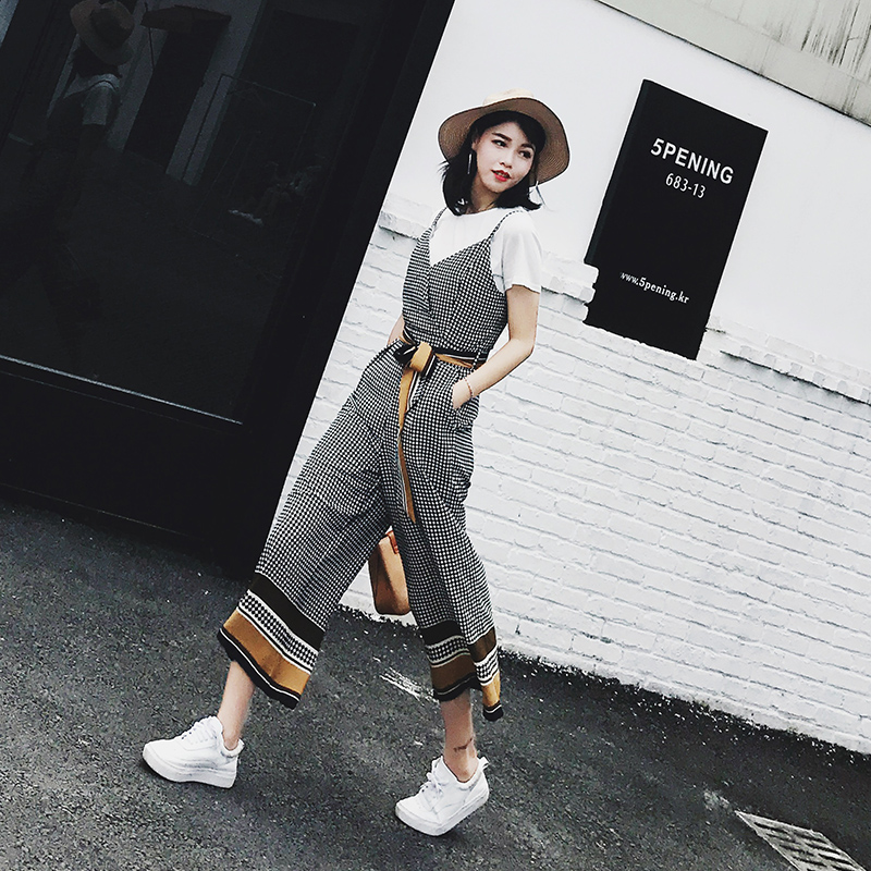 连体裤是夏天不可缺少的单品之一,而这一款吸引了小编的目光,因为它实在是带太独特,太美观又太时尚,黑白格子的花纹简约时尚,腰带和裤腿处的装饰相搭配,设计感十足,阔腿裤潇洒飘逸,清凉舒适。整体的版型挺阔潇洒,上身的效果棒棒的。二、T恤牛仔背带阔腿裤套装
