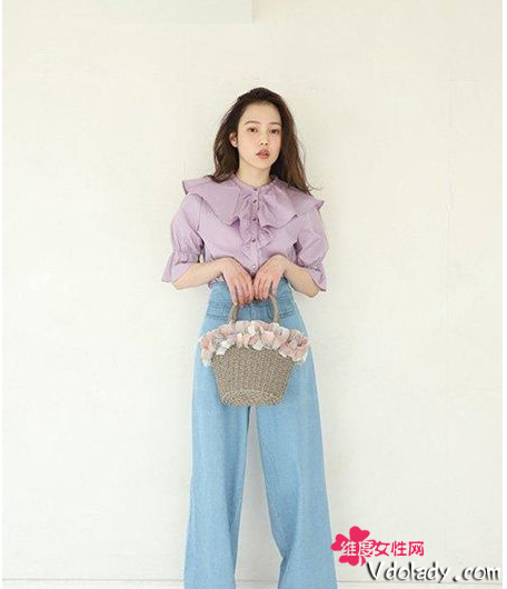 衬衫+阔腿裤 春天牛仔阔腿裤配什么上衣好看?选择一点花样的衬衫,远比穿死板的白衬衫要来的有活力的多,高腰款式的牛仔裤,搭配薰衣草紫色的荷叶边衬衫,甜美知性,搭领口设计不仅能增加华丽感,还有很好的显瘦效果呢!