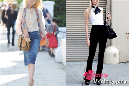 二、丝巾+雪纺衫的搭配 对于一些女士白领来说,上班的时候一点小心机的装饰也是很必要的。图一是素色雪纺衫和蓝色牛仔裙的搭配,一条碎花丝巾很好地给这一身带来了亮点,而且颜色选择和这一身也很配,而图二是偏正装一些的,无袖白色雪纺衫加上黑色长款,看起来很干练