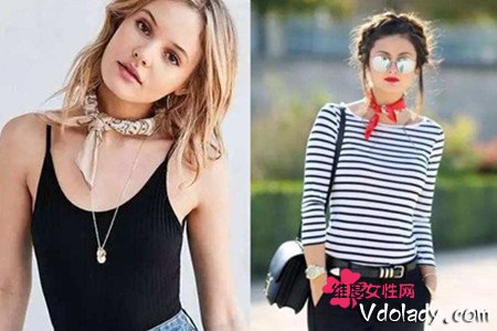 三、丝巾+背心T恤的搭配 丝巾本身有很多系法,根据你自身的衣着风格可以系成不同的样子,随你喜欢,图一搭配黑色的背心,就选择简单的系在脖子上,马上就显得很有个性很不一样,而图二红色小丝巾搭配黑白条纹T恤也是很有特色,让你在黑白中加点红色,很有画龙点睛的效果。