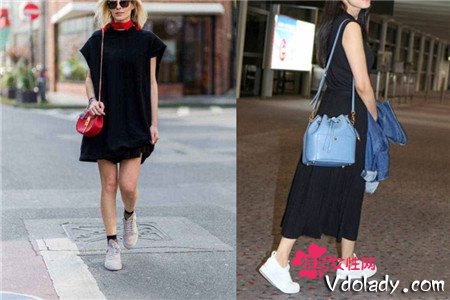 图一中的这套搭配也很不错,黑色宽松款连衣裙搭配白色运动鞋,脖子间的红色和包包形成呼应,小细节间传达着“我很精致”。图二中则是一款无袖长裙搭配黑色运动鞋,比较优雅的一套搭配,而且也有年轻人的活力在里面。