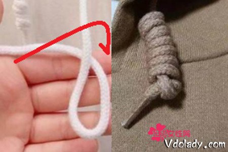 一、卫衣帽子绳子螺旋结。 这是小编比较喜欢的一种打结方法,看起来小巧精致,而且不易散开,操作起来也比较简单。首先,将卫衣帽子绳子往上对折一次,如左图所示,然后按照红色箭头方向将绳子自由一端反复缠绕几圈,直到缠绕到只剩低端一个小圆圈时,将末端绳子穿入固定即可。至于对折时的中心点,大家可以依据自己的喜好进行挪动,效果都差不多。