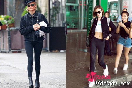 欧美明星就经常穿着紧身弹力运动裤出街,紧身运动裤和高跟鞋的搭配就很有新意,少了一点运动感,更像是把黑色运动裤当成打底裤在穿。国内明星袁姗姗(凭借“马甲线”吸粉无数,一直积极健身的她就身穿紧身运动裤现身机场,搭配白色运动鞋和运动背心以及棒球服,活力十足!