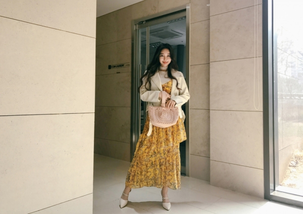雪纺长款连衣裙+牛仔外套 当下牛仔外套可以说是花样百出超短牛仔外套也是很受女孩子们的喜爱,搭配雪纺长款连衣裙增加了层次感。雪纺连衣裙的温柔与牛仔外套帅气柔和在一起增加了时髦度。