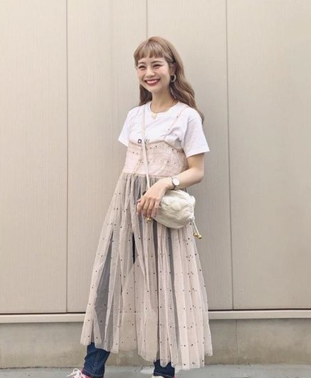 吊带裙 第二种也是长裙款式,感觉上更像是吊带裙,用长而薄的网纱罩住全身,有点迪奥仙女的感觉,同样也是增加穿搭层次感,遮住大象腿,显瘦效果也很好呢。对学生妹而言,用白T、牛仔裤、球鞋,再加上网纱给人的感觉就是美美哒呢,软萌又可爱,很俏皮的感觉。