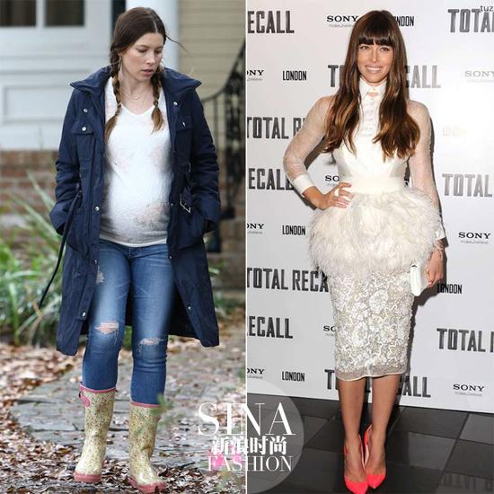 杰西卡-贝尔是美国的演员、模特,着装大胆又出位,只有怀孕期间选择了牛仔、工装风衣的休闲搭配。