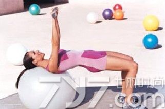 两脚分开与肩同宽,脚朝前。向后躺,使臀部和下背部靠着健身球的边缘。双手各持一只5~10磅(2.3~4.5公斤)的哑铃,手臂向下伸,靠在球前。收紧腹部,收缩肱二头肌,弯曲手臂,将哑铃提向肩部。头部和颈部向后仰,靠在身后的健身球上,收缩臀部,将胯部抬起,直至胯部与地面平行。将哑铃向胸部上方举起。然后再将胯部和手臂还原至初始位置,重复整个动作,做10~12次。