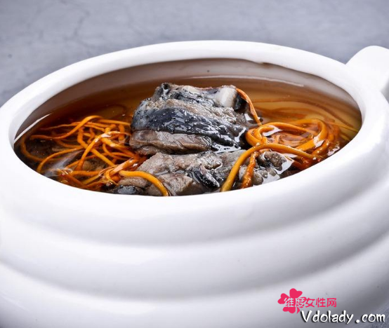 冬虫夏草10克,乌骨鸡块300克,料酒、葱、姜、盐、味精、五香粉各适量。冬虫夏草水发后洗净,与乌骨鸡肉块、料酒、葱、姜一起入锅,加水煮沸,改小火煮至乌骨鸡肉块酥烂,加入盐、味精、五香粉调味即可。每日1剂,分2次佐餐食用,可连用数剂。具有温肾补虚、止带等功效。适用于肾虚型阴道炎等。