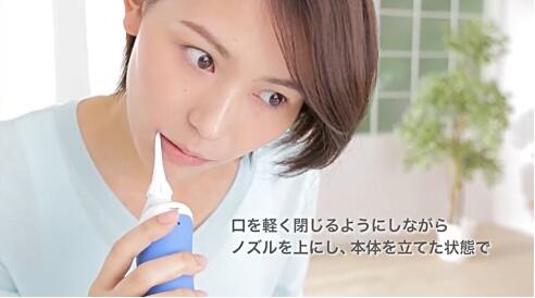 三. 微微俯身,将冲牙器放入口打开开关,闭口冲洗。冲牙时对准齿缝贴合冲洗 不要离得很远,这样的冲牙动作可以让你全面冲到口腔里的每一颗牙齿和每一丝角落。松下小白塔的超声波水流能够直接冲洗牙龈,对牙龈也有按摩强健的作用。