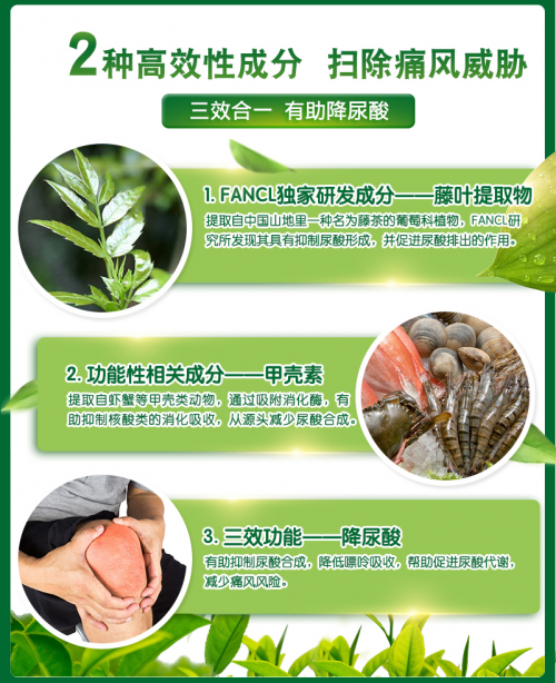 对于在外应酬的人来说,饮食结构并不容易改善,行之有效的手段是利用保健品,从吸收、合成、排出三方面入手降尿酸。这款正在电商平台上热卖的FANCL HealthScience尿酸丸是日本第一款兼具这三个功效的降尿酸机能性表示食品,藤叶提取物能够抑制尿酸的合成、促进尿酸排泄;从甲壳类动物中提取的甲壳素有助于抑制食物中嘌呤的吸收,并从源头上减少尿酸合成。三管齐下效果显著!