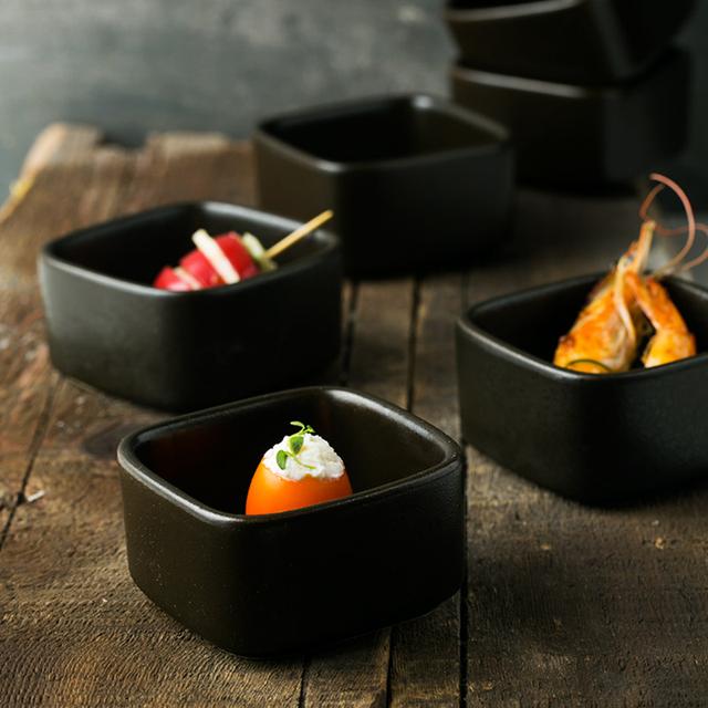 黑色的四方小碟,简单大气,色泽清雅,容量较小,可以用于盛装调料、小菜等,碟身上的做旧点缀让碟子更加活泼,为你的餐桌增添色彩。