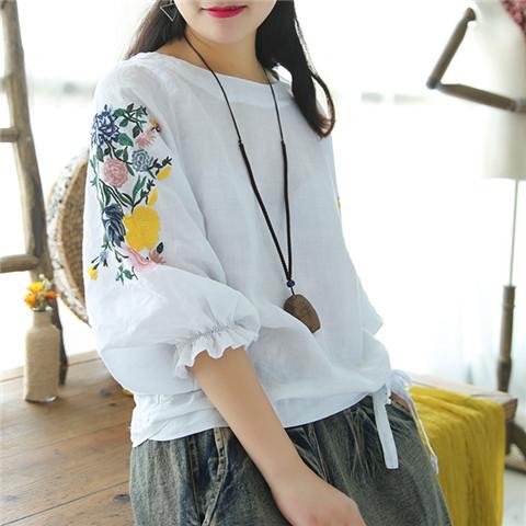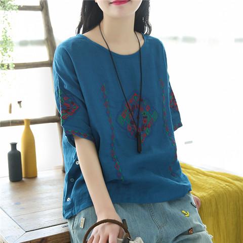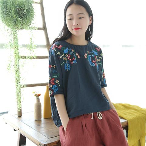 小耳出品夏季复古刺绣韩版五分袖亚麻上衣,这款小耳出品夏季复古刺绣亚麻上衣,圆领设计,领围、袖口包边,前短后长下摆,高温难耐也抵挡不住绣花的热情。