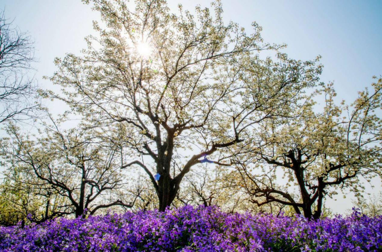梦里我穿过一片绿色的杉林,走过一汪碧蓝的湖泊,邂逅了一个身着百花裙的姑娘。她站在一片花海里,旋转,跳跃,在那大片大片紫色的衬托下,笑得像个孩子!而后,她领着我,往花海更深处走去。随后,进入视野的,就是一片淡淡素雅的梨花儿白。一望无际的白紫交融,让我在梦中也惊叹得出了声!