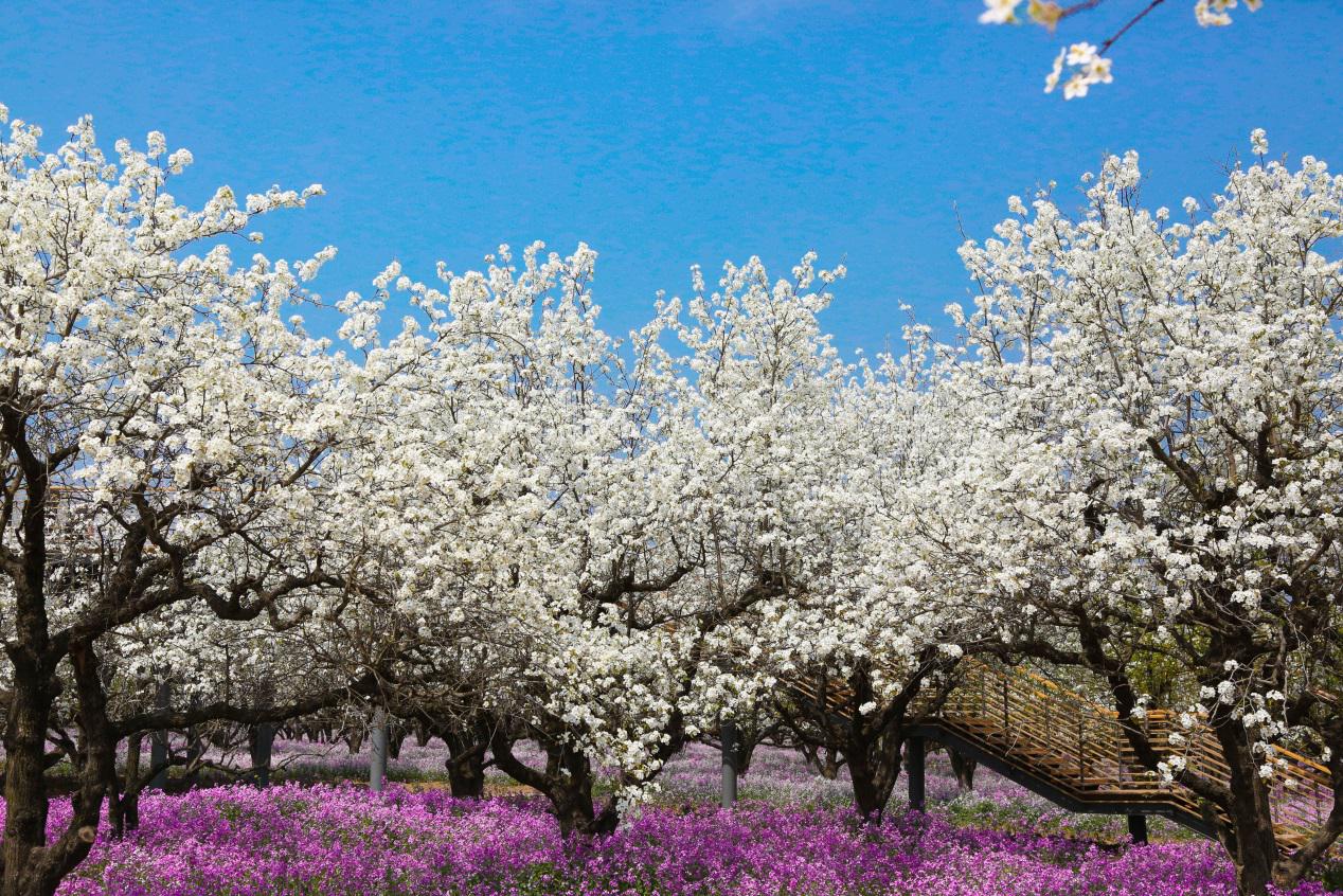 漫游途中,抬眼,那是满山遍野的白色浪漫。风来,花瓣似雪花飘落,想与你一起跑到树下走到白头,带走一阵梨花香。