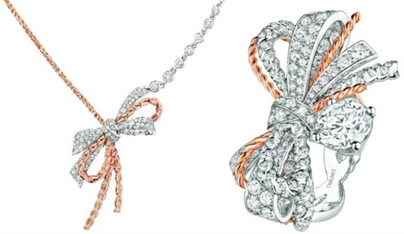 最高端的珠宝也会在蝴蝶结上做足文章,CHAUMET的Insolence如意结系列白金、玫瑰金项链和戒指。