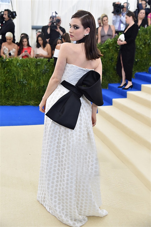 每年热门红毯上更是少不了它,比如刚刚结束的metball上莉莉·詹姆斯身穿的Burberry蜂巢印花抹胸裙,简约黑白配多亏了背后那个蝴蝶结,抢镜不少。