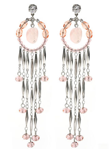 Erickson Beamon的流苏耳坠色彩清新而晶莹,如同倾泻而下的泉水,让人想要伸手去触摸。其实耳坠主体部分只有柔粉色珠子的是水晶,而下面的流苏是不透明的金属,其细长多棱面的造型形成了透明折射的错觉。