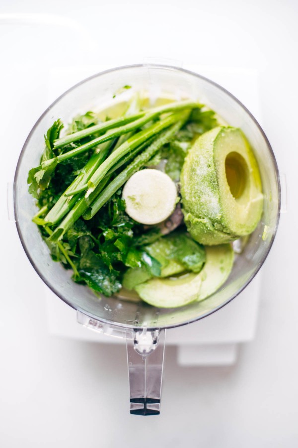 将事先准备好的牛油果去核之后放入到搅拌机里,随后再放入欧芹、西葫芦以及大葱段。