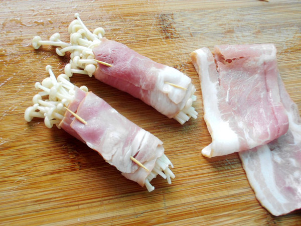 3. 培根从中间切开每块分成两份。铺开一份培根,取适量金针菇放在一头,卷起来把金针菇卷在里面,然后用牙签固定。依次卷好10个培根卷。
