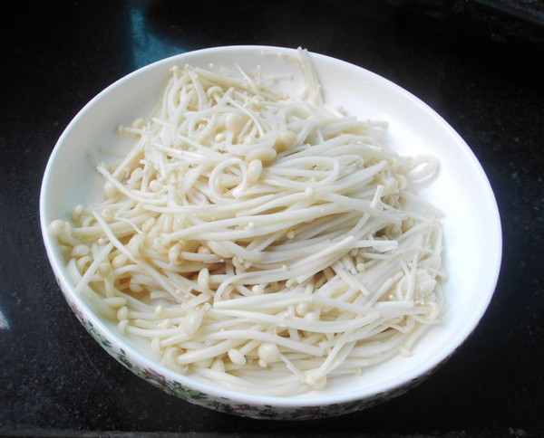 2. 金针菇整把切去根部,洗净,入开水中焯两三秒捞出沥干水分。