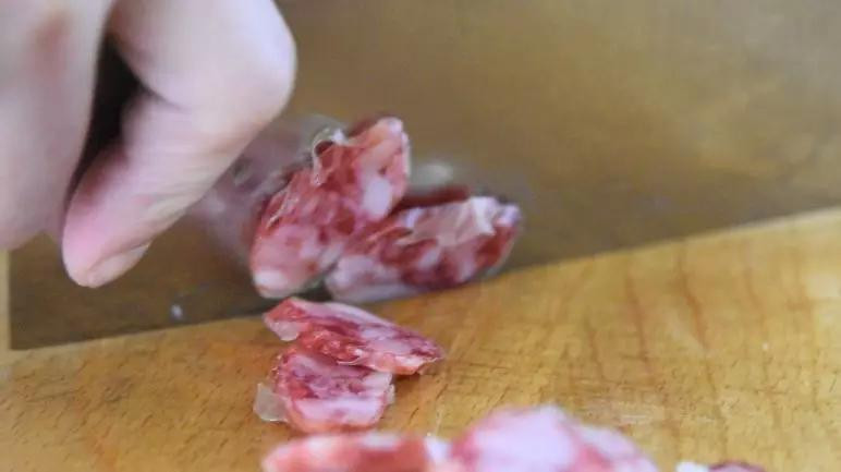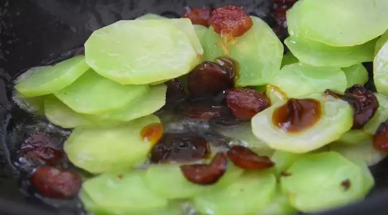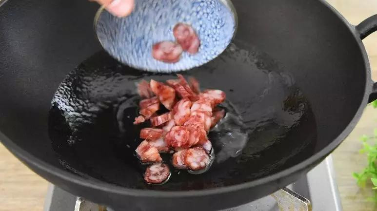 3.热锅冷油,倒入香肠,小火煸炒出油脂