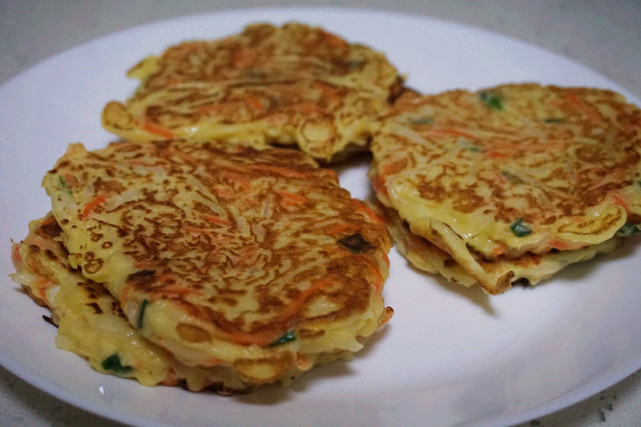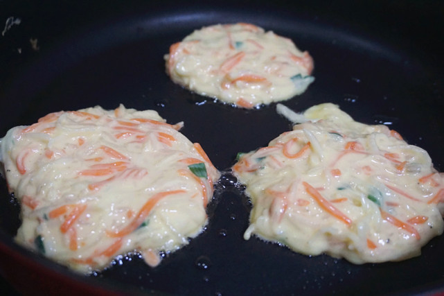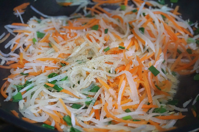 另一种营养的食材——胡萝卜,相对而言更容易被大家接受,因为胡萝卜是脆甜脆甜的。不少经典的川菜、日常炒菜,都少不了用到胡萝卜。这道萝卜丝饼,就是混合里白萝卜和胡萝卜,食材炒断生后,白萝卜去除了辣味,而胡萝卜中的β-胡萝卜素,是脂溶性维生素,就是溶解于脂肪里才易于吸收,所以也需要炒一下。