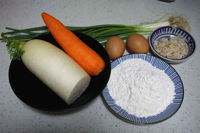 白萝卜半根、胡萝卜1根、鸡蛋2个、面粉适量、香葱1小把、虾皮适量、食用油、盐、白胡椒粉