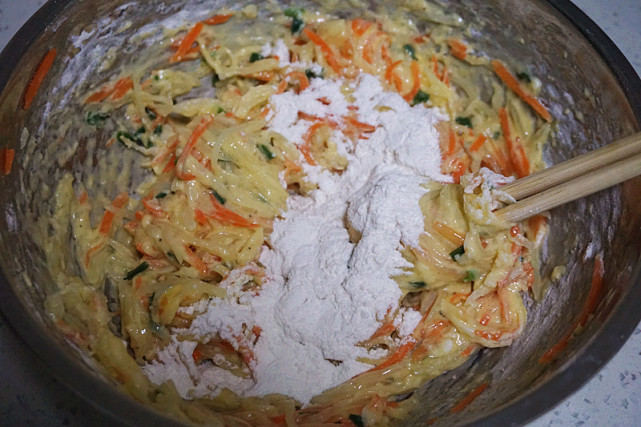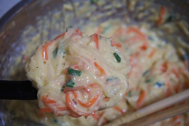 4、面粉别一次加入很多,分几次加入,每次加入用筷子一个方向搅拌,粉完全融入再继续加。过程中不用加水,因为萝卜丝里的水分还有蛋液就够了。