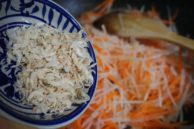 2、白萝卜里放入少许小虾皮特别好吃,能提鲜。加入适量盐、香葱末和白胡椒粉,翻炒均匀。