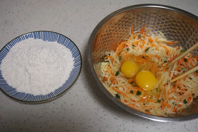 3、萝卜丝炒好盛出晾到温热,再加入2个鸡蛋。