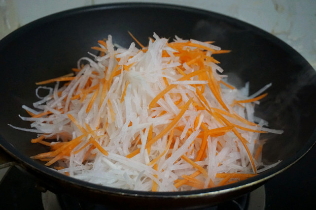1、准备好需要的食材,红白萝卜擦成丝。白萝卜水分大,有些朋友喜欢先用盐杀水,直接放入锅里炒,水分也能蒸发掉。
