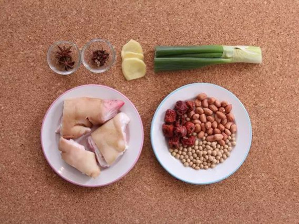 材料:猪蹄、红枣、黄豆、花生、大葱、姜、八角、花椒、盐