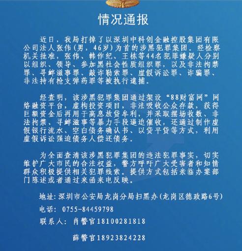 据深圳市公安局官方微博“深圳公安”公布得知,因涉嫌非法吸存后放高利贷,深圳中科创实控人张伟等44人涉黑被捕!据了解,通告还披露,经查明,该涉黑犯罪集团通过架设“88财富网”网络融资平台,虚构投资项目,非法吸收公众存款等罪行,具体事件正在调查中!