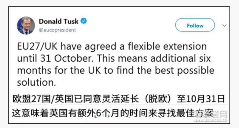 欧洲理事会主席图斯克随后在推特确认延期一事,并表示英国已同意欧盟的决定。