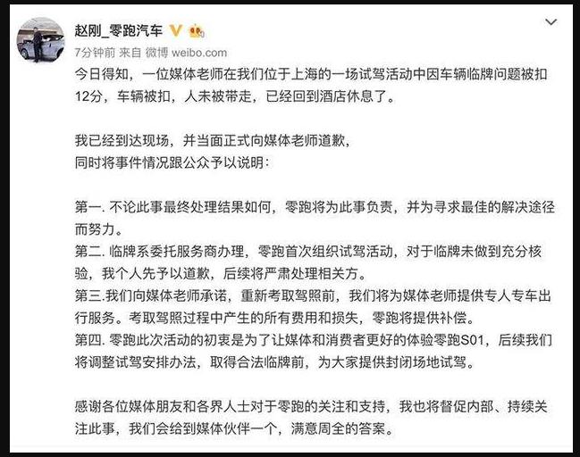 正值上车展期间,不少车企由于场地的限制所以将事假搬到了市区的马路上,但没想到也因此引出了麻烦事儿。这不就有媒体反应零跑汽车组织试驾活动使用假临牌,导致编辑被拘留还扣12分。零跑汽车副总裁赵刚通过微博对此事发表说明称,人未被带走,已经回到酒店,零跑将为此事负责。