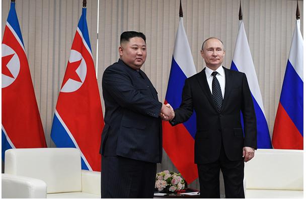 4月25日,在俄罗斯符拉迪沃斯托克,俄罗斯总统普京(右)与朝鲜最高领导人金正恩握手。