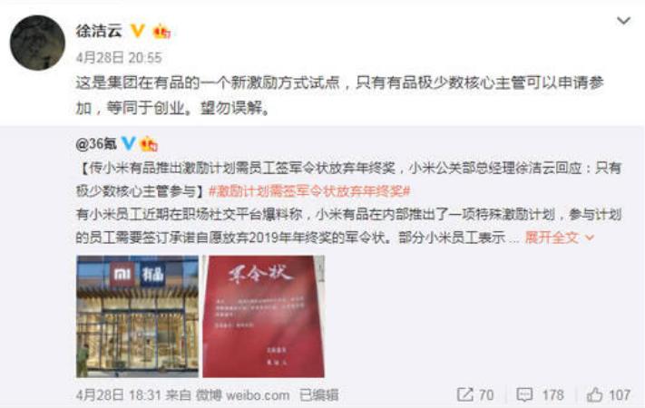 4月29日消息,针对有媒体报道称小米有品在内部推出一项特殊激励计划,需员工签军令状放弃年终奖一事。4月28日夜间,小米集团公关部总经理徐洁云在微博回应称,“这是集团在有品的一个新激励方式试点,只有有品极少数核心主管可以申请参加,等同于创业。望勿误解。”