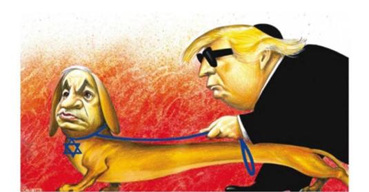 据此前媒体报道,这幅漫画出现在上周四(25日)的《纽约时报》国际版上。在这幅漫画中,以色列总理内塔尼亚胡被描绘成了一只“导盲犬”,引导着带着墨镜的“失明”的特朗普。而在“内塔尼亚胡”的脖子上,还戴着代表了犹太教和犹太文化的标志“大卫星”。