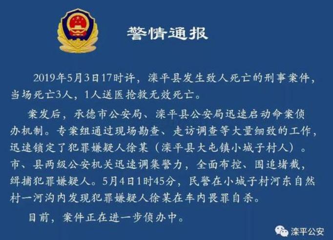 2019年5月3日17时许,滦平县发生致人死亡的刑事案件,当场死亡3人,1人送医抢救无效死亡。
