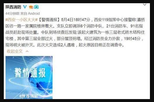 通报指出,5月4日18时47分,西安119指挥中心接警称:灞桥区纺一路一家属院楼房着火。支队立即调派6个消防中队、21台消防车、91名指战员赶赴现场处置。中队到场侦查后发现:该起火建筑为一栋三层老式砖木结构住宅楼,其中第三层全部过火,部分屋顶坍塌。经过消防员全力扑救,19时45分,现场明火被扑灭。此次火灾造成2人遇难,起火原因目前正在调查中。