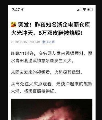 5月14日晚10时50分,位于丽水青田县的意尔康股份有限公司电商仓库起火,过火面积约6000平方米(房屋为2层钢架结构),无人员伤亡。据初步统计,仓库内库存的8万双皮鞋被烧毁,造成经济损失约1000万元。