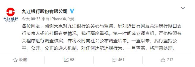 九江银行通报称,各位网友,感谢大家对九江银行的关心与监督,针对近日有网友关注我行湖口支行负责人杨沁挂职有关情况,我行高度重视,第一时间成立调查组,严格按照有关程序进行调查核实,并将及时向社会公布调查结果。一直以来,我行坚持公平、公开、公正的选人机制,对任何违纪违规行为,一旦查实,将严肃处理。