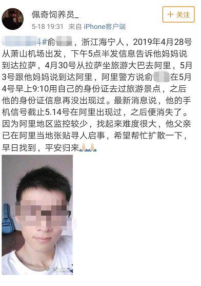 消息的发布者是小俞的亲属,其时27岁的海宁人小俞已经在西藏阿里地区失联超过18天。